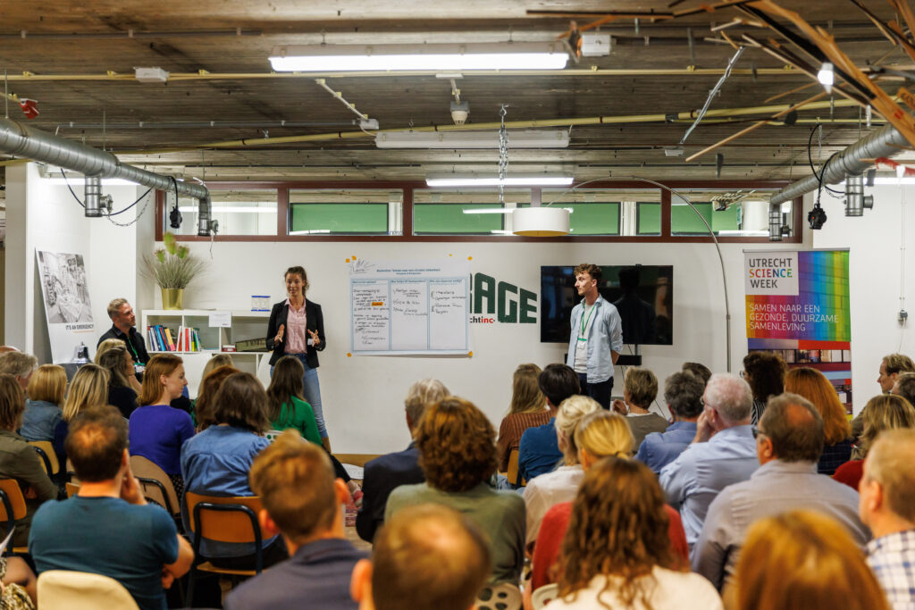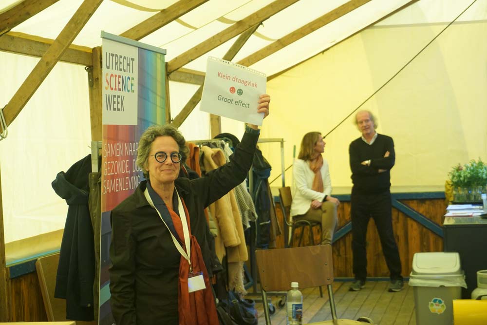Dat aspect sprong misschien wel het meeste in het oog tijdens de week: samen bezig zijn, samen ontwikkelen, samen oplossen. Wetenschappers, sprekers, publiek en gasten; iedereen kon meepraten, denken en doen. Bij de Dag van de Duurzaamheid bijvoorbeeld, waar tientallen bezoekers na een gezamenlijke opening aan de Padualaan in groepen actuele onderwerpen behandelden. Of de Hackathon bij UtrechtInc, waar de hele dag werd gewerkt aan slimme oplossingen rondom het thema circulaire ziekenhuizen.